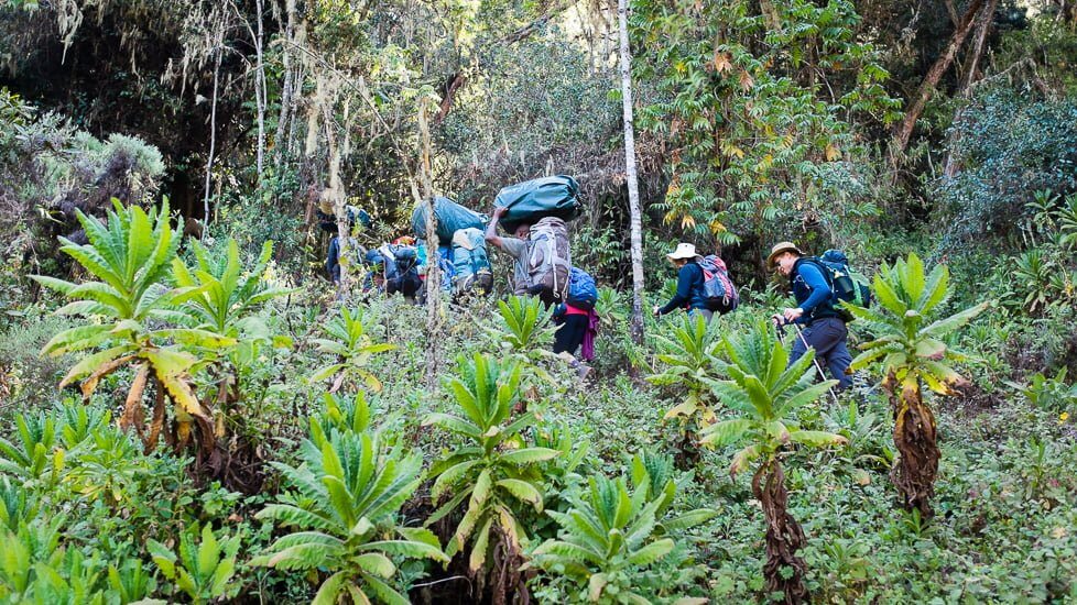 You are now ready to begin your 3-hour hike into the rain forest. Be on the look out for Colobus monkeys! Along the way, you will stop for an afternoon lunch break and arrive at Mti Mkubwa (“Big Tree”) Campsite (2750m) in the early evening. The porters, who arrive at the campsite before the clients, will set up your tent and boil water for drinking and washing. The chef will prepare a snack then dinner for the clients. At nighttime, mountain temperatures may drop to freezing so be prepared!